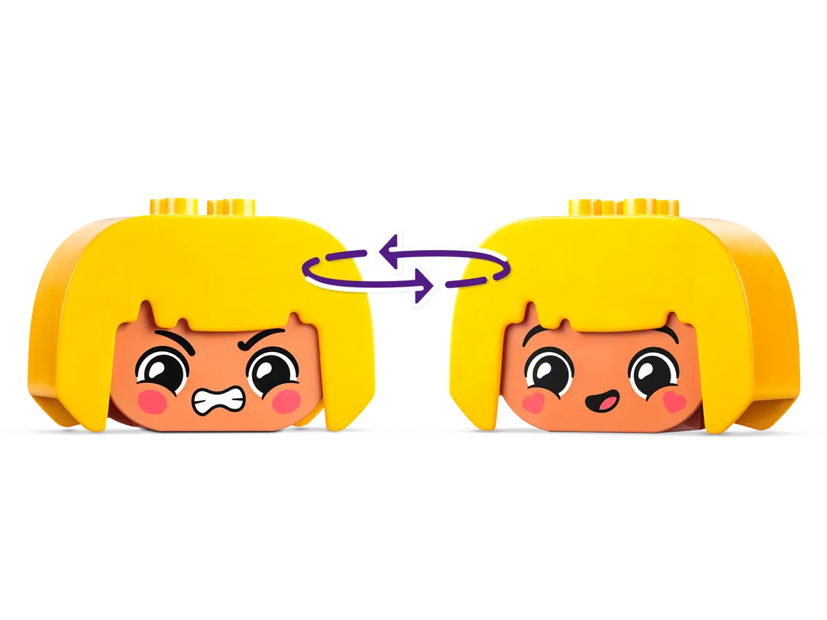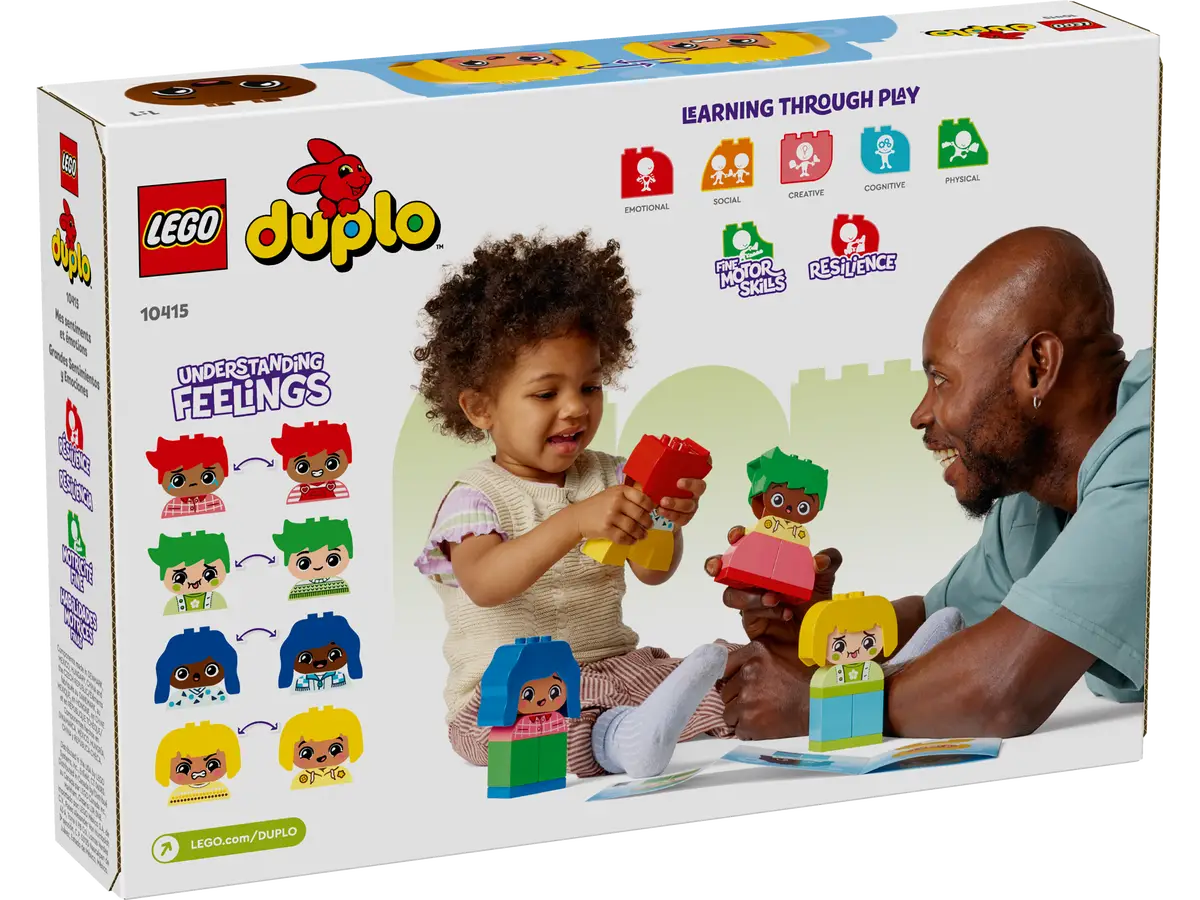 LEGO® DUPLO® Große Gefühle (10415) ist ein Lernspielzeug, das Kleinkinder ihre emotionalen Reaktionen entdecken lässt. Das Set beinhaltet 4 ganz verschiedene Figuren mit jeweils 2 unterschiedlichen Gesichtern, damit Vorschulkinder die Miene der Spielzeugfiguren verändern und auf diese Weise vermitteln können, wie sie sich fühlen.